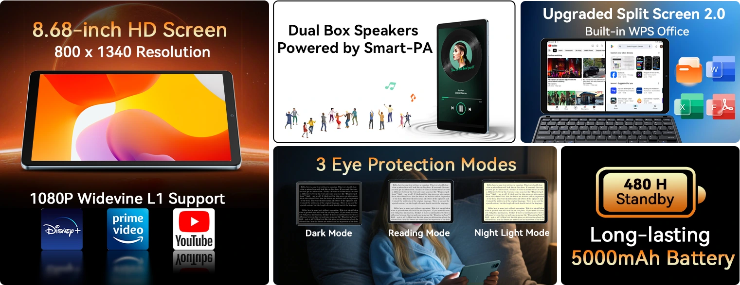 Blackview LINK 2 verfügt über einen 8,68-Zoll-HD-Bildschirm mit ultra-bequemem 16:10-Goldenem Schnitt, genau die richtige Größe zum Lesen von Nachrichten, Anschauen von Shows mit der Familie oder Durchscrollen von Fotos. Klar, flüssig und einfach zu bedienen – alles in deiner Handfläche.